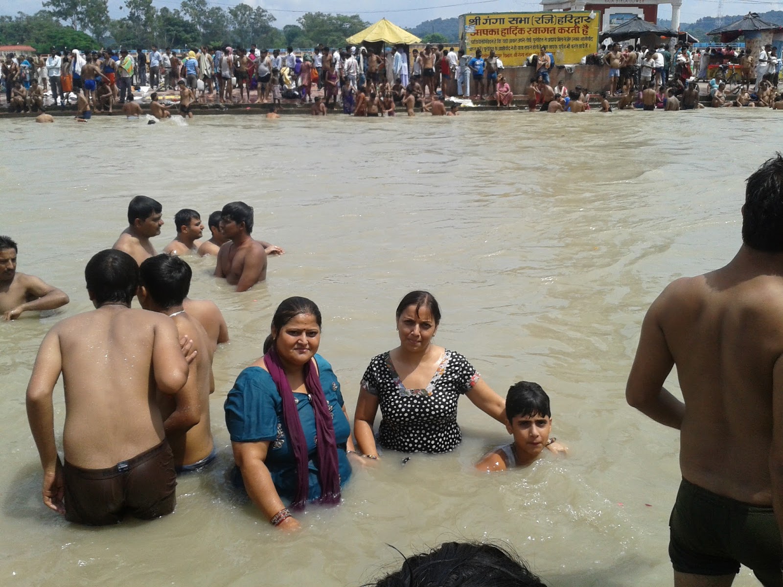 हम सुबह 6.30 पर दिल्ली से चलकर दोपहर 1.30 बजे तक हरिद्वार पहुँचगए थे क्योंकि हर की पौड़ी की तरफ जाने वाले सारे रास्ते वाहनों के लिए बंद कर दिए जाते हैं इसलिए भीमगोड़ा रोड पर ही हमने एक दिन के लिए एक होटल ले लिया था यहाँ जाकर हमने अल्प विश्राम किया और फिर सब चल पड़े हर की पौड़ी की तरफ गंगा में डुबकी लगाने |